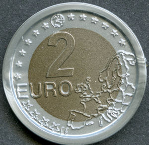 '2 euro' and map of europe. arc of stars above. small 'ce'