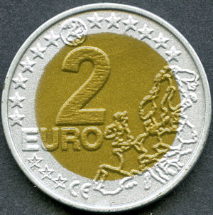 '2 euro' and map of europe. arc of stars above. small 'ce'
