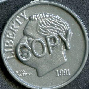 'united states of america' over olive branch, torch and oak with 'num' over 'one dime' with dominant relief 'copy'